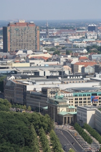 | Das Bild zeigt die Philharmonie Berlin. Anfangs war der Bau umstritten, mittlerweile ist der von 1960 bis 1963 errichtete Bau wegen seiner Architektur und Akustik Vorbild für viele Konzertsäle weltweit. | Links hinter dem Kulturforum ist der Reichstag mit seiner Kuppel sehr schön zu erkennen. | Rechts neben dem Kulturforum hat man einen sehr schönen Blick auf den Potsdamer Platz. | Hier ist der Blick Richtung siegessäule zu sehen - die frisch renovierte "Goldelse" ist herrlich zu sehen. |