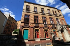 | Aber auch die benachbarten Wohngebäude sind äußerst sehenswert, da die Fassaden soweit möglich originalgetreu restauriert wurden. Sehr hübsch ist das Fassadenornament an einem Wohnhaus nahe der Bibliothek, auf dem des Häuschen zu sehen ist, das über der Gesundbrunnenquelle stand. Gleiches gilt für einen etwas weiter entfernt liegenden Gebäudedurchgang zu einem Hinterhaus, in den ich durch einezufällig offen stehende Tür blicken konnte (sehr hübsch waren die alten Holztüren und das Holzschild, auf dem die Namen der Anwohner standen - um die Privatsphäre zu achten, habe ich aber nicht weiter fotografiert). | ||