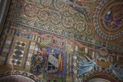 Im zweiten Weltkrieg wurde die Kirche fast vollständig zerstört. Die Kirchenoberen entschieden, wenigstens den Turm stehen zu lassen. Daneben entstand ein moderner achteckiger Kirchenraum aus blauen Glasbausteinen. In dem alten Turm der Kirche befindet sich eine frei zugängliche Gedenkhalle mit sehr schönen Mosaiken aus der Zeit um 1900 (siehe Fotos unten). Sie zeigen Szenen aus dem Leben Wilhelm I. und der Hohenzollernfamilie. |