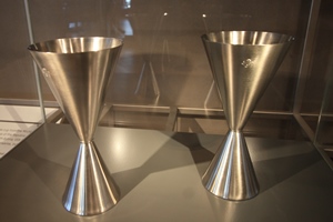 | Das Bild war Teil der Gemäldegalerie im Hauptfoyer des 1976 eröffneten Palastes der Republik. Unter dem Titel "Dürfen Kommunisten träumen?" waren hier 16 Bilder ausgestellt. Dieses Bild hat den Titel "Guten Tag" und stammt von Wolfgang Mattheuers. Die brutal in die Natur gebaute Industrielandschaft wird heute als Kritik an politischen Fehlentwicklungen gedeutet. | Das ist ein Überwachungsmonitor aus dem Palast der Republik. Als besonderes "Sicherungsobjekt" der Staatssicherheit war der gesamte Außen- und Innenbereich überwacht: Angestellte wurden überprüft, Besucher observiert, Telefone abgehört und zentrale Orte mit Kameras beobachtet. DDR-kritische Personen, die hier auftraten (z. B. Udo Lindenberg), wurden systematisch bespitzelt. | Teil des insgesamt 14 m langen Bronzereliefs aus dem Foyer der Volkskammer, die sich auch im Palast der Republik befand. Das Relief sollte die Entwicklungsgeschichte der Menschheit darstellen, die nach Ausbeutung, Unterdrückung und Klassenkämpfen eine kommunistische Gesellschaft anstrebt. Bei seiner Demontage wurde das Relief in 43 Teile zerschnitten - die Frage ist, wo die restlichen Teile geblieben sind ... | Reste des Kaiserliches Bads im Schlosskeller. | Das sind Eisbecher aus der Milchbar im Palast der Republik. In diesen Edelstahlbechern wurden Eiskaffee und Eisschokolade serviert - in der DDR rare Genussmittel. |